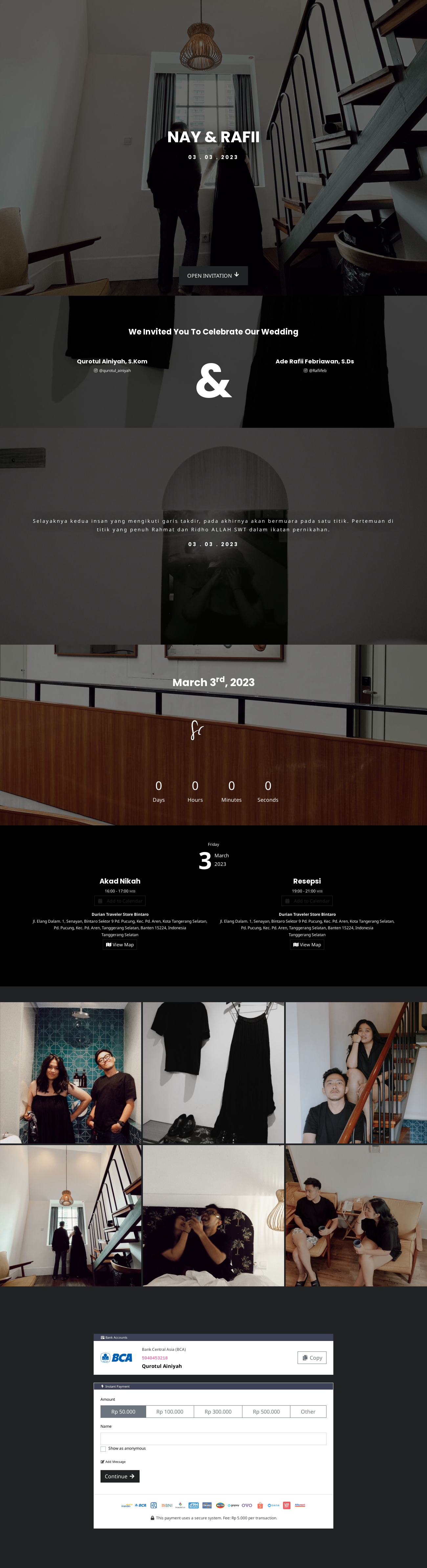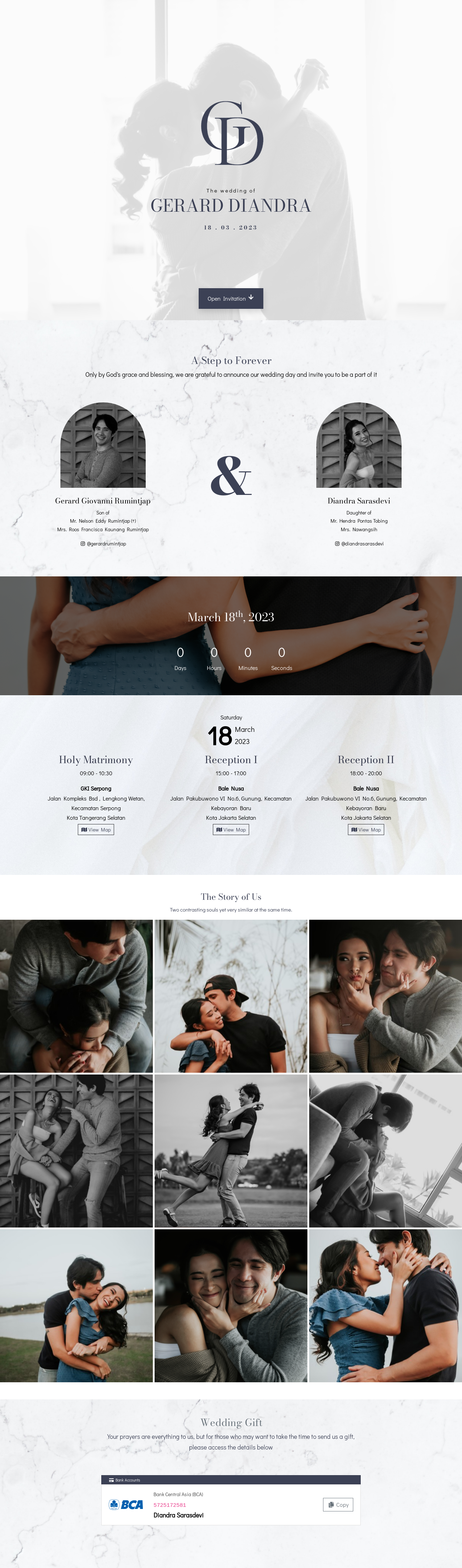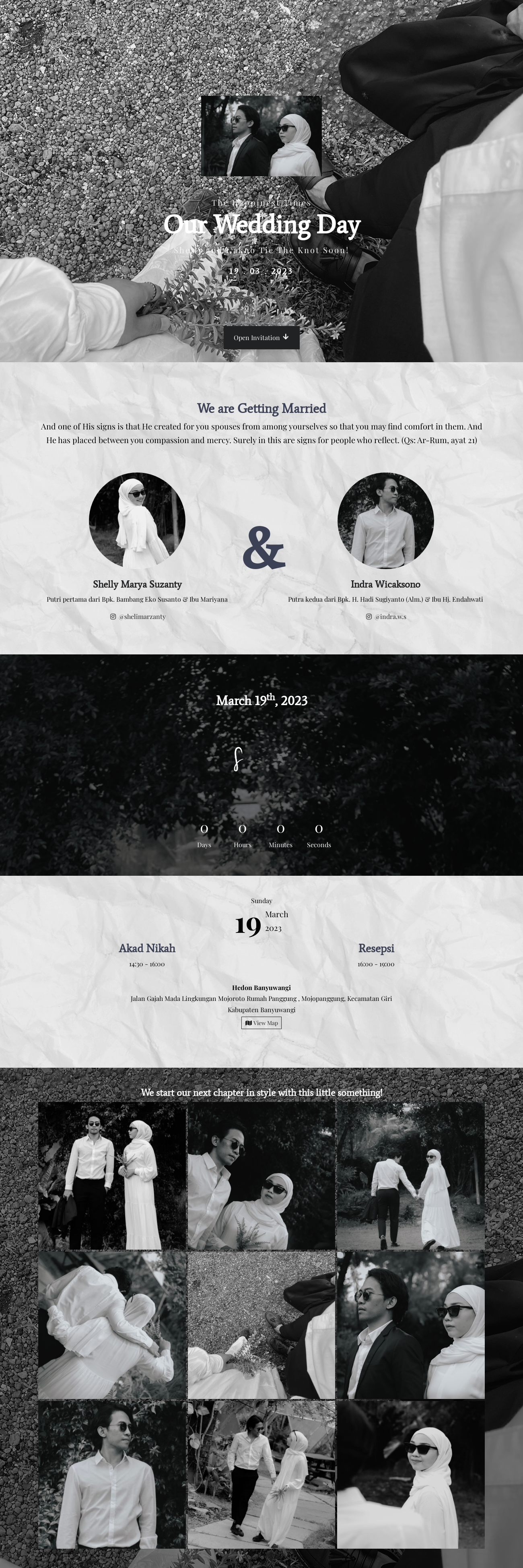 Dalam pernikahan undangan website ini sangatlah penting, mengingatnya keterbatasan mengirimkan undangan fisik dan memerlukan waktu yang banyak untuk membagikan undangan fisik / cetak. Maka dari itu saya ada untuk kita semua, dengan konsep exclusive, elegant dan minimalist yang memberikan kesan profesional